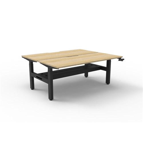 Rapidline Boost back to back 2 person manual crank height adjustable workstation with cable tray. Oak top with black frame.