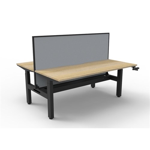 Rapidline Boost back to back 2 person manual crank height adjustable workstation with cable tray and screen. Oak top with black frame.