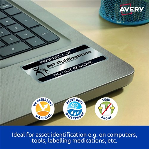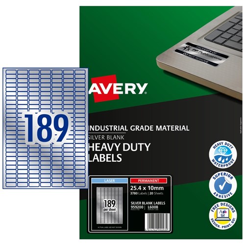 AVERY L6008 DURABLE H/D LABEL Laser 189/Sht 25.4x10 Slvr Met Pack of 3780
