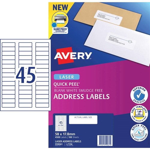 Size: 58x17.8mm 4500 labels, 100 sheets, 45 labels per sheet (45UP).