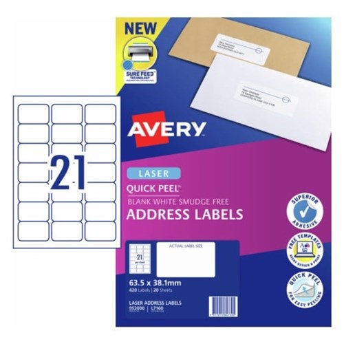 AVERY SURE FEED LABELS Laser 38.1 x 21.2mm White Pack of 650