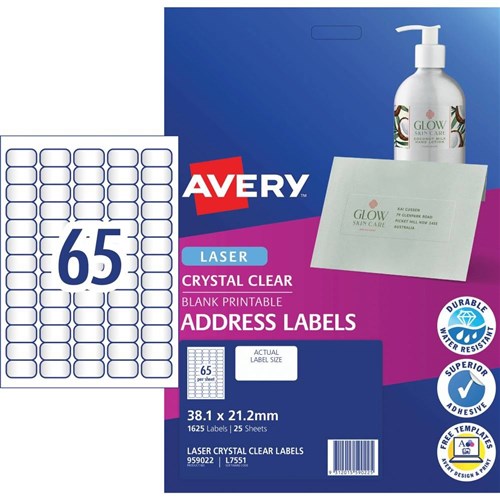 AVERY L7560 CLEAR LASER LABELS Quick Peel 21/Sht 63.5x38.1mm Pack of 525