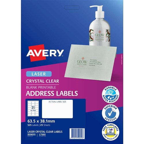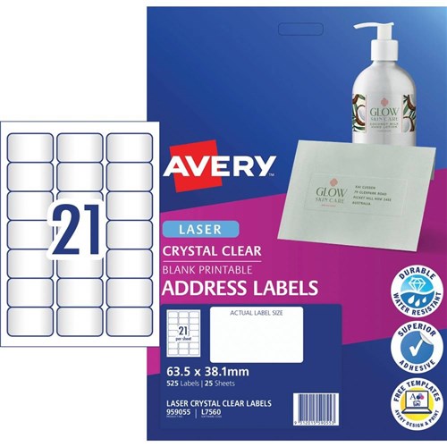 AVERY L7560 CLEAR LASER LABELS Quick Peel 21/Sht 63.5x38.1mm Pack of 525