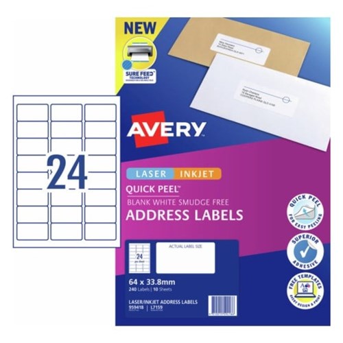 AVERY SURE FEED LABELS Laser 64 x 33.8mm White Pack of 240