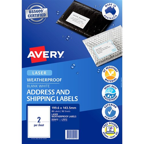 AVERY WEATHER PROOF LABELS Laser 199.6x143.5mm White Pack of 20 L7072