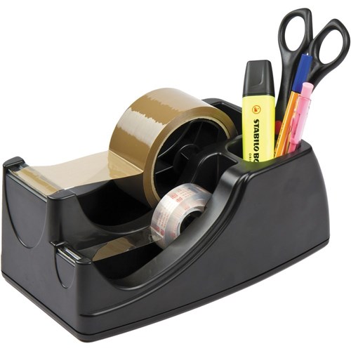 This dispenser has two spindles and a place to hold your pens, scissors etc.