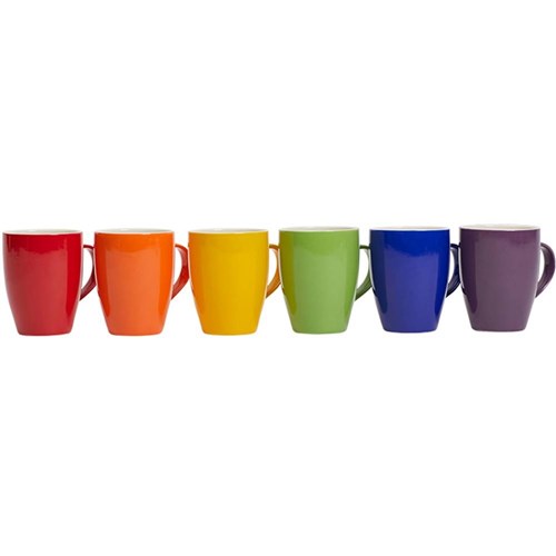 Attractive stylish set of 6 mugs in a range of designer polished colours purple, red, orange, blue, yellow and green.