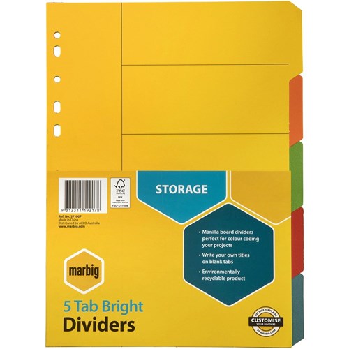 MARBIG BRIGHT MANILLA DIVIDERS A4 5 Tab Xtra Wide MultiColour Includes 5 Tabs