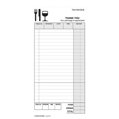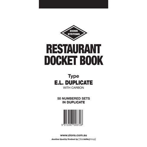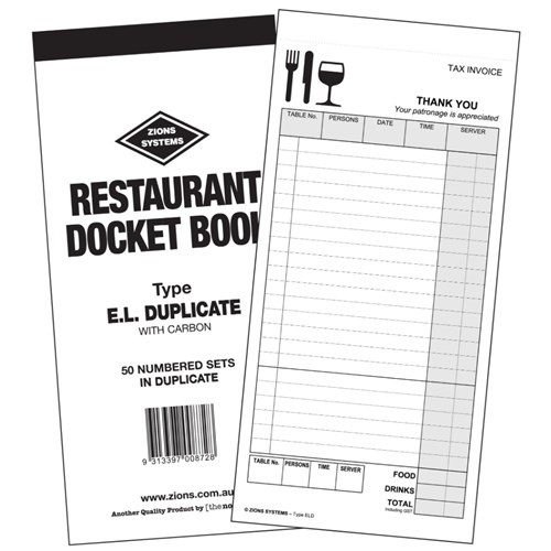Zions offers a wide range of single, duplicate, triplicate and quadruplicate restaurant docket books, suitable for all styles of bistros, cafes, restaurants and take-away outlets.