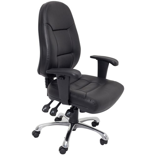 Executive operator chair with high back and adjustable arms. Comes standard with a range of adjustments, seat and back tilt, seat slide for extra seat depth, and ratchet back for easy back height adjustment.