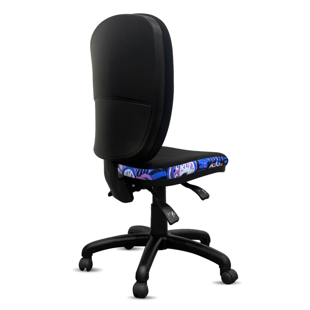 A unique commercial fabrics designed by Murdie Nampijinpa Morris (Indigenous Artist) combined with K2 Black Fabric to upholster the chair.