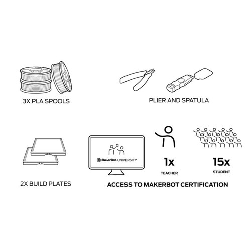 It includes 1 Sketch printer, 3 spools PLA, 2 build plates, 1 teacher and 15 student MakerBot certification program.
