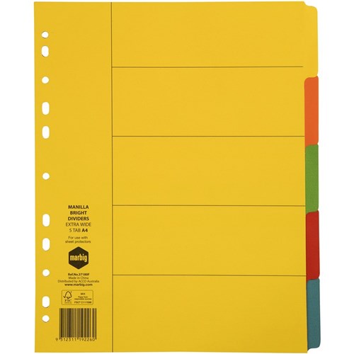 MARBIG BRIGHT MANILLA DIVIDERS A4 5 Tab Xtra Wide MultiColour Includes 5 Tabs