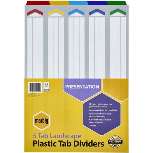MARBIG COLOURED DIVIDERS A3 1-5Tab Board L/Scape Asst Includes 5 Tabs