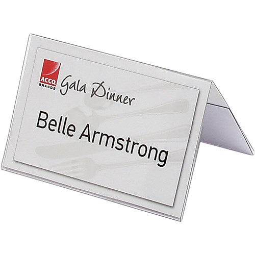 Clear plastic name plates with insertable cards to display titles, names etc.