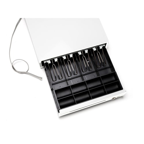 The cash drawer is a gloss white colour.