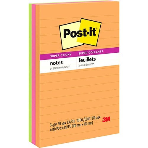 Super Sticky Post-it® adhesive ensures that notes stick practically anywhere such as computer monitors, filing cabinets & furniture, and remain as easily removable as original Post-it® Notes.