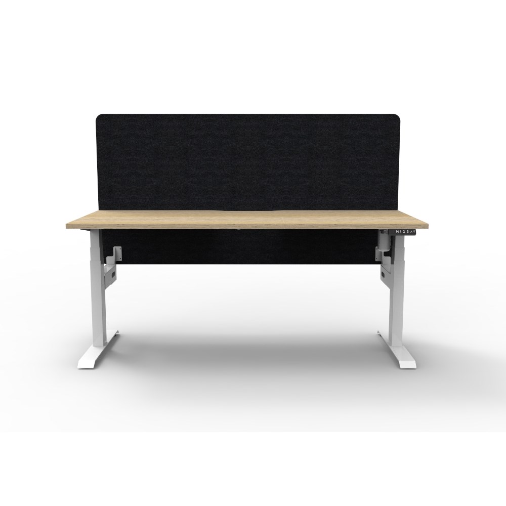 Electric height adjustable single sided workstation with Natural Oak top and White Satin frame, Black Eco screen.