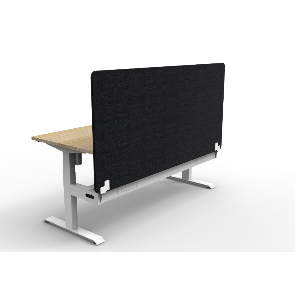 Electric height adjustable single sided workstation with Natural Oak top and White Satin frame, Black Eco screen and cable tray.