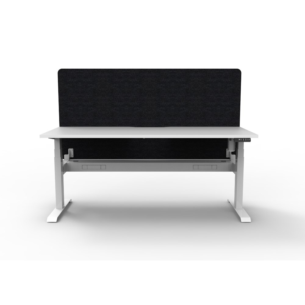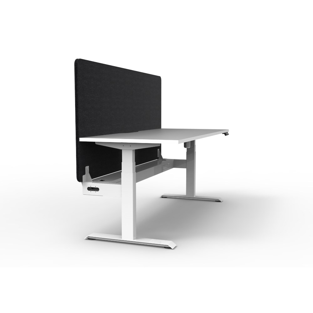 Electric height adjustable single sided workstation with Natural White top and White Satin frame, Black Eco screen and cable tray.