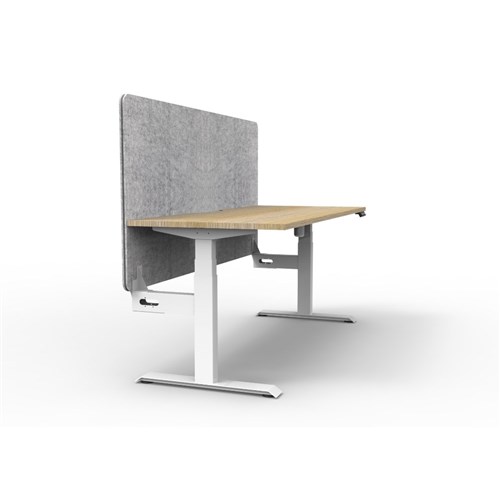 Electric height adjustable single sided workstation with Natural Oak top and White Satin frame, Grey Eco screen.