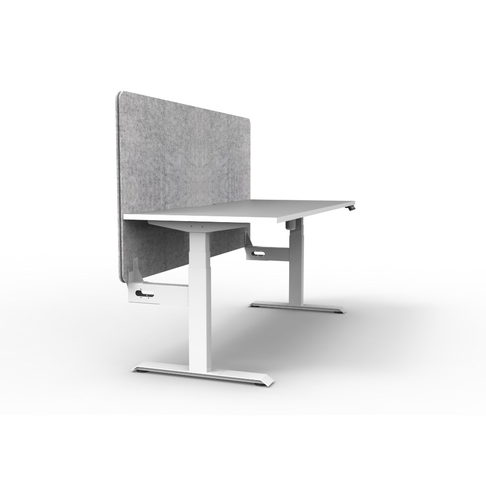 Electric height adjustable single sided workstation with Natural White top and White Satin frame, Grey Eco screen.