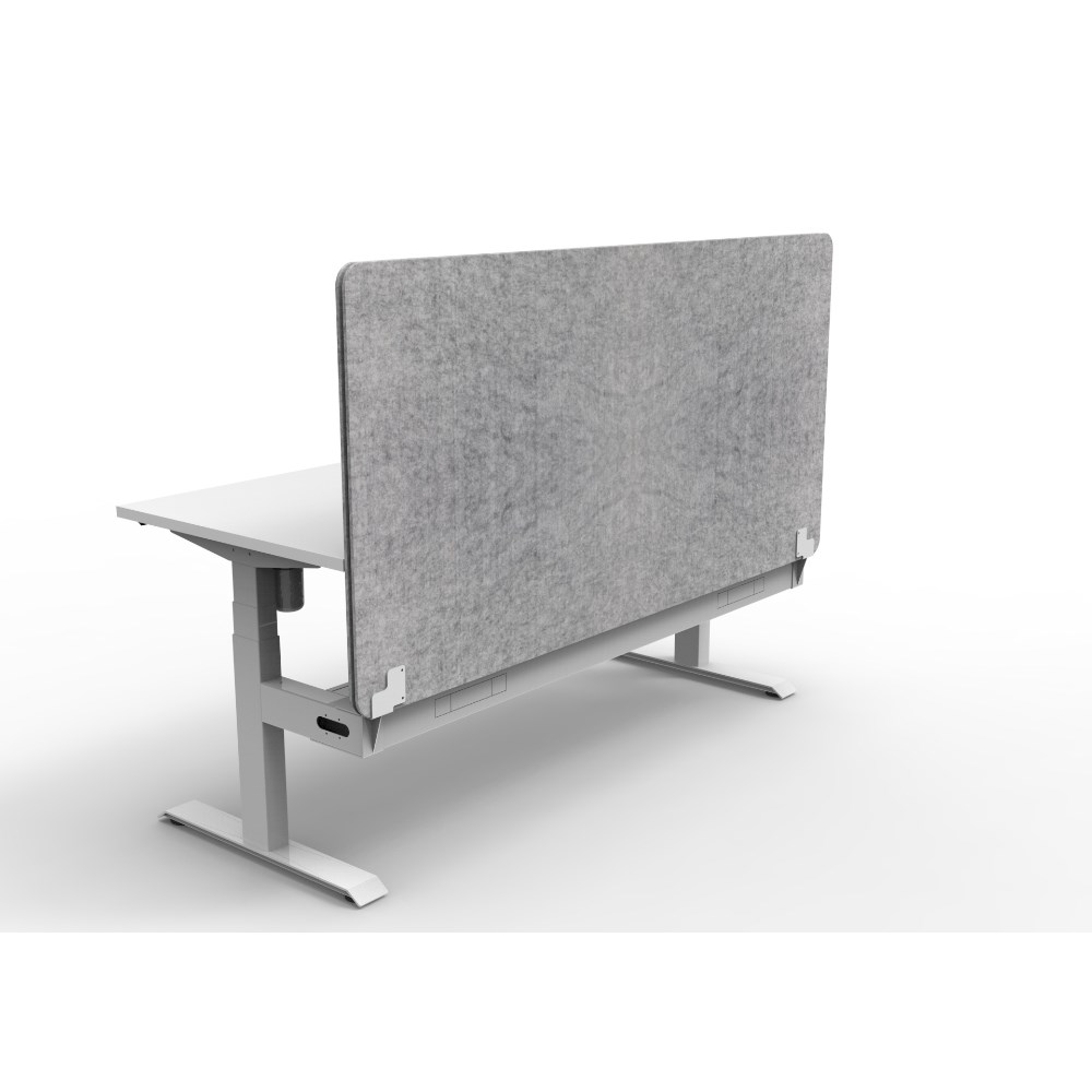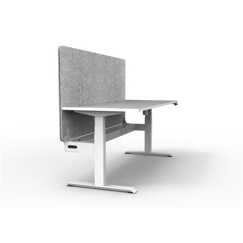 Electric height adjustable single sided workstation with Natural White top and White Satin frame, Grey Eco screen and cable tray.