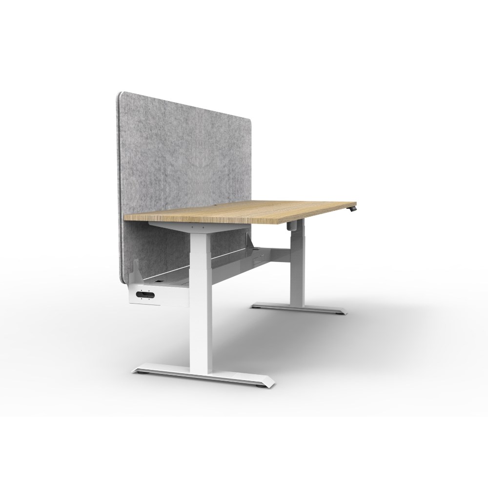 Electric height adjustable single sided workstation with Natural Oak top and White Satin frame, Grey Eco screen and cable tray.