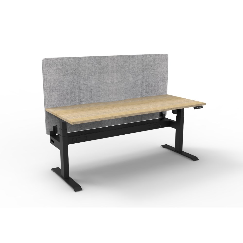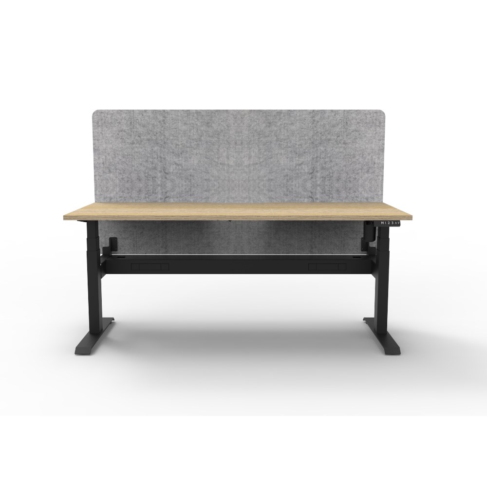 Electric height adjustable single sided workstation with Natural Oak top and Black Satin frame, Grey Eco screen and cable tray.