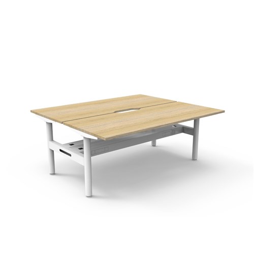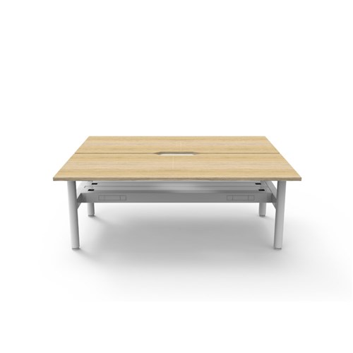 Natural Oak top White Satin frame. Double sided workstation with cable tray.