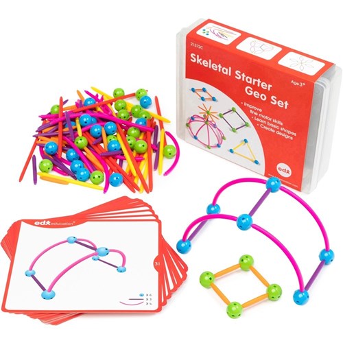 Set includes 80 sticks in 4 sizes and 4 colors, 40 connecting balls in two colors, 24 quarter circles, and 20 x double-sided activity cards, in sturdy container.