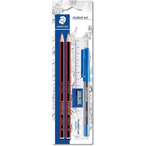 Tradition® set contains: 2x HB graphite pencils, 1x Rasoplast® small eraser (526 B40), 1x Stick 430 ballpoint pen (430 M-3), 1x 15cm ruler & single hole plastic sharpener.