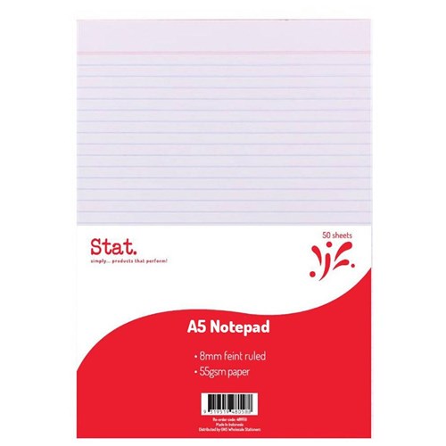 STAT NOTEPAD A5 7MM RULED 55Gsm White 50 Sheet
