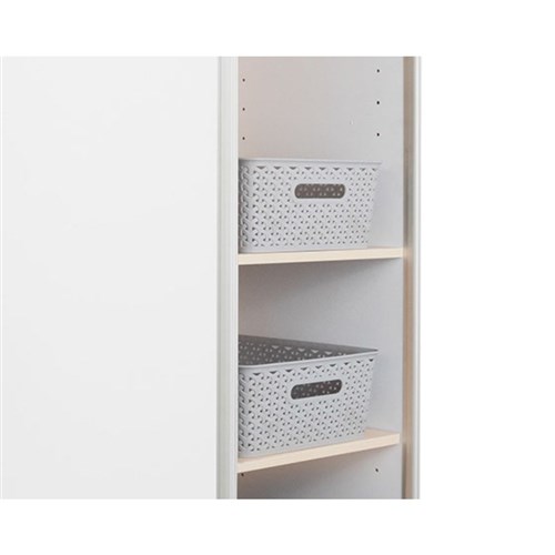 Easily movable double sided magnetic whiteboard with storage that is split into two making it perfect for shared and adaptable learning environments.